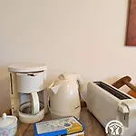 The kitchen amenities at the Jublains holiday home feature a refrigerator, provided in an outdoor dining area. L'Orgetorix is a restaurant serving French dishes a mere 13 minutes on foot from Le Gasseau, 4-5 Pers, Pmr Villa.